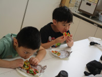 仕上げに自分が持ってきた調味料をかけ、おいしく食べました。手軽に作れる料理なので、6年生の皆さん、お家の方に作ってあげてくださいね。