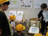 そして、いよいよ代表の児童に手渡されました。グローブでキャッチボールをしたい人と呼び掛けると、ほぼ全員が手を挙げましたが、今回は東雲イーグルスで野球をしている高学年の児童に代表でしてもらいました。感想は、「とりやすかった」「ちょっと小さかった」でした。二人とも上手にキャッチボールをしました。